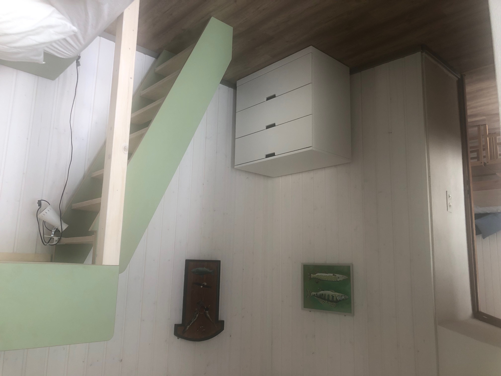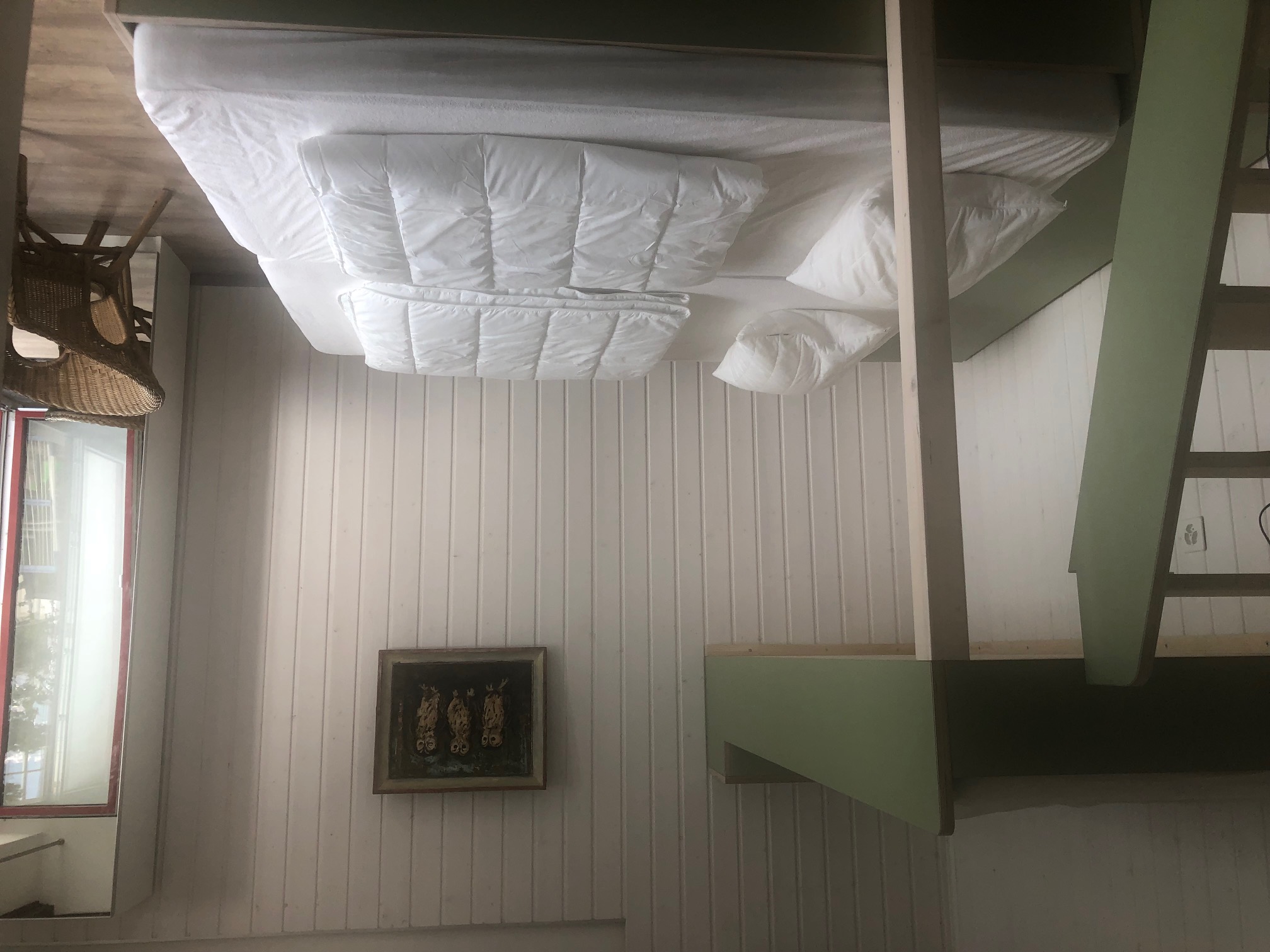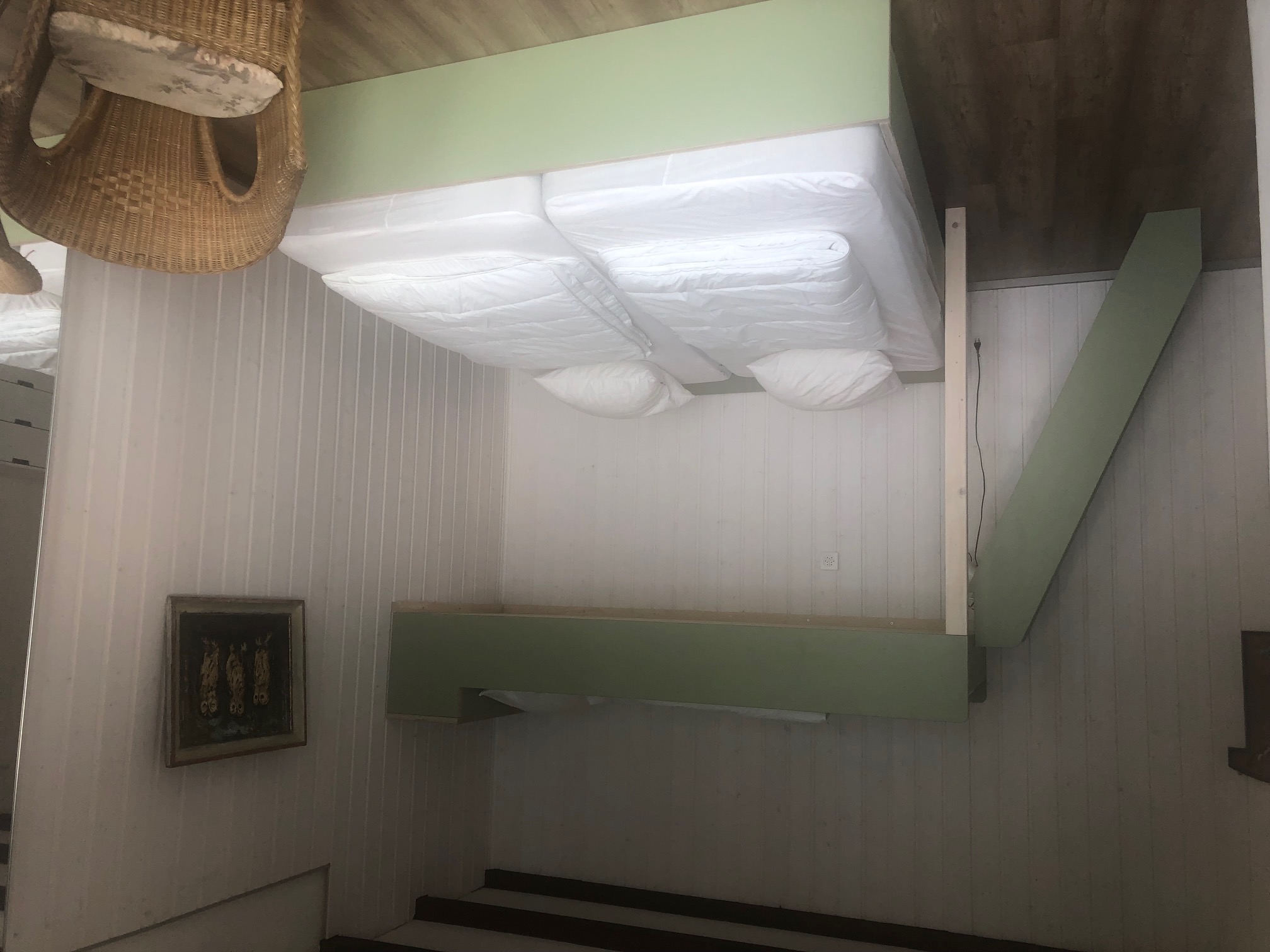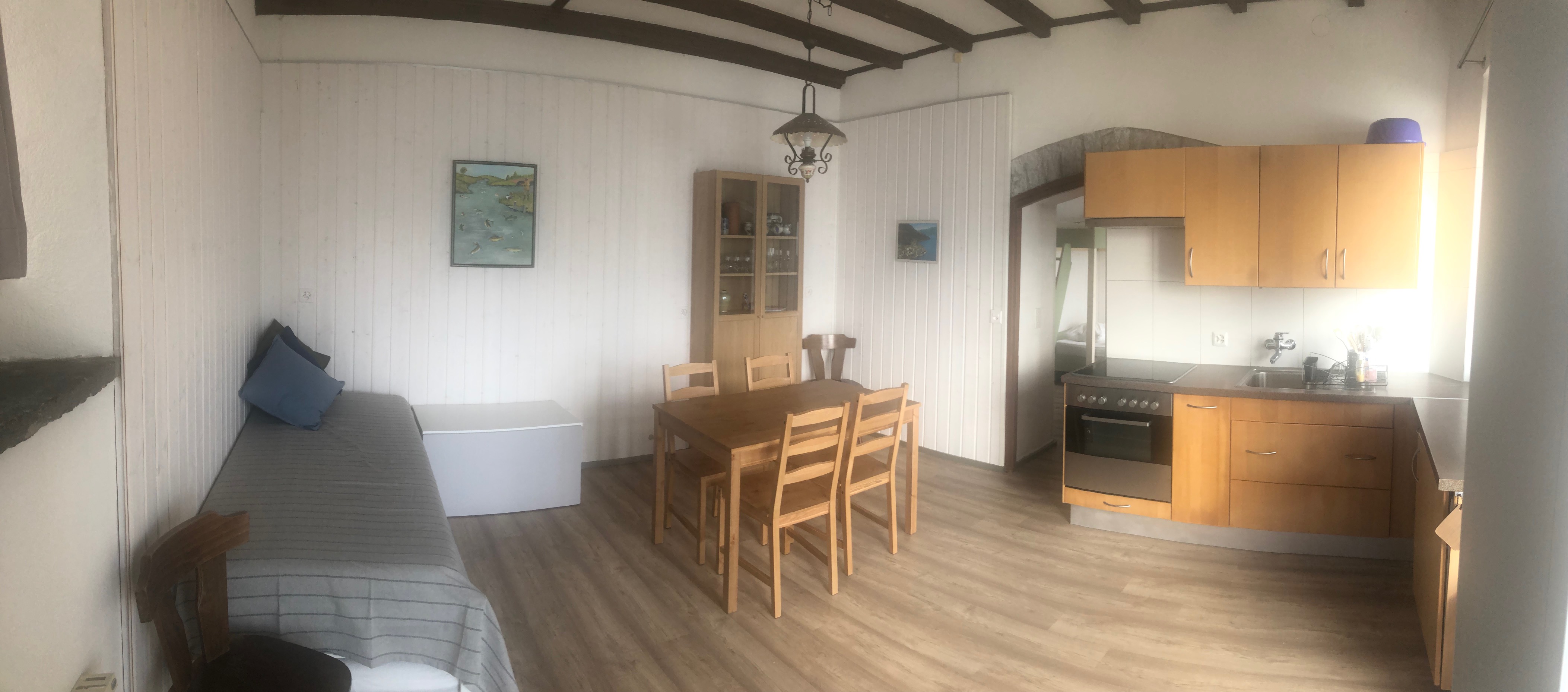 2 Zimmer, 4 Betten. Längs der Wohnung befindet sich ein breiter Balkon mit Sonnenstoren. Die Liegewiese befindet sich direkt am See.