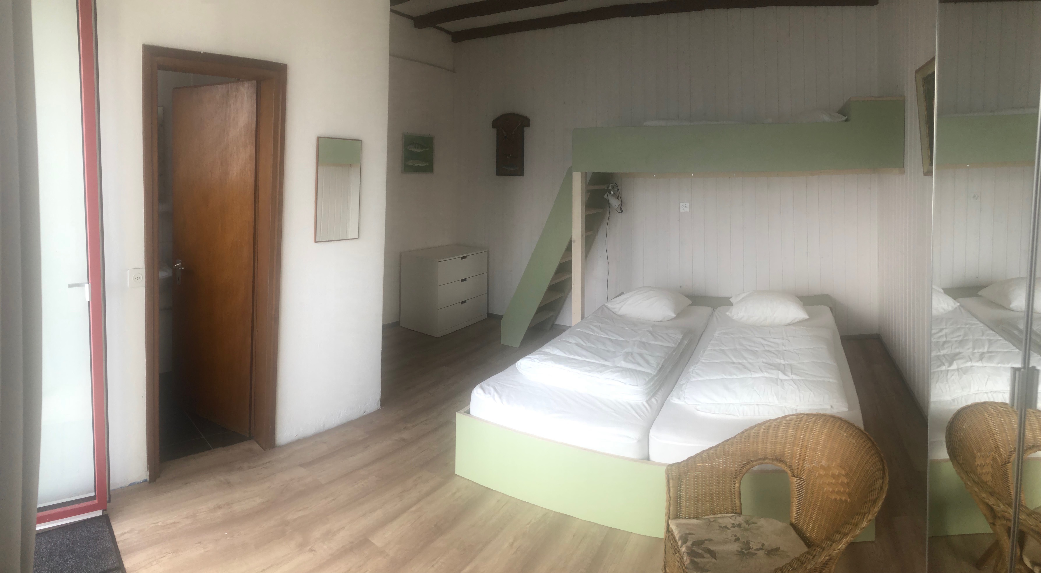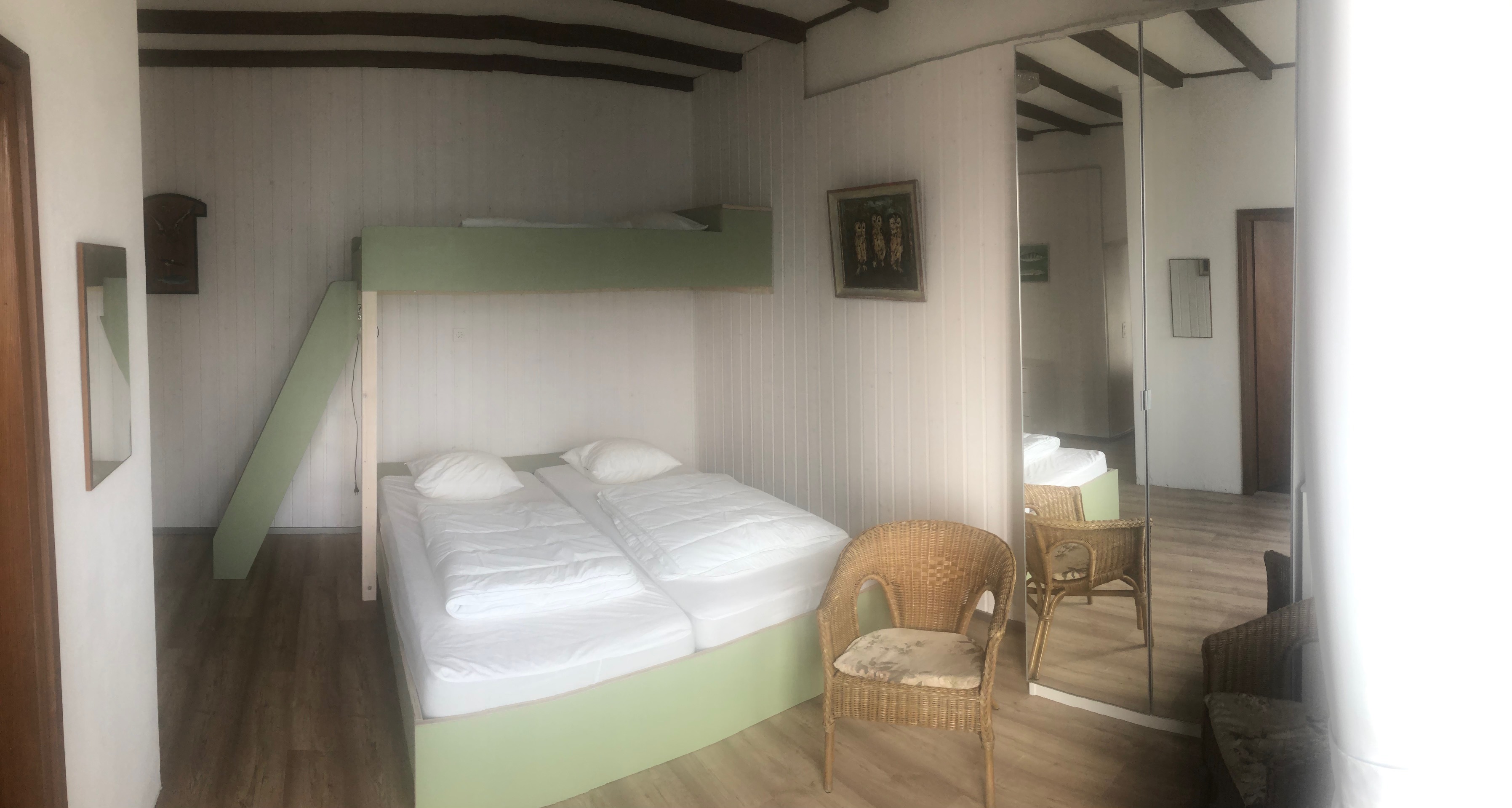 2 Zimmer, 6 Betten. Direkt vor den Zimmern ist eine grosse gedeckte Terrasse und die dazugehörende Liegewiese. - Ferienwohnung «Terrasse»